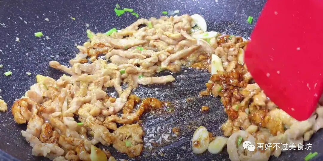 7、再次起锅,加入少许食用油,下入葱姜蒜翻炒,炒出香味,炒好之后把肉丝加进来继续翻炒几下,然后再往里面加入一点老抽上色,继续翻炒均匀。