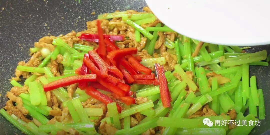 8、翻炒均匀后,再把芹菜加进来,给它翻炒均匀,然后再把红椒丝也加进来,这个时候开大火,给它再次翻炒均匀。