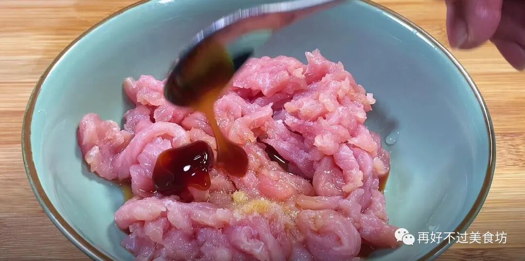 3、再准备一块瘦猪肉,改刀切成片,再切成肉丝,切好之后装入碗中,往里加入少许食盐、一勺生抽、一勺料酒、一小勺蚝油,然后用手给它抓拌均匀,给肉丝入底味。