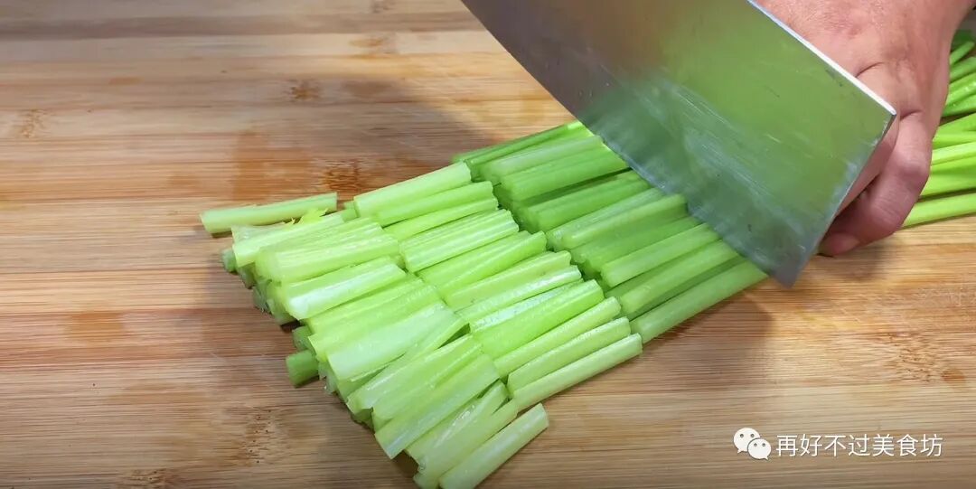1、先把清洗干净的芹菜从中间划开,这样会更加容易入味,然后再改刀切成小段,切好之后装入盘中备用。
