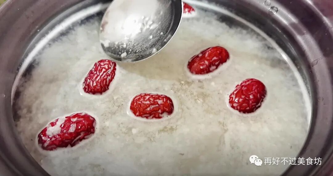 5、砂锅内放入清水,加入一勺的黄冰糖和几颗洗净的红枣,盖上盖子煮至水开,水开后倒入切好的马蹄,略微搅拌均匀,打去上面的浮沫。