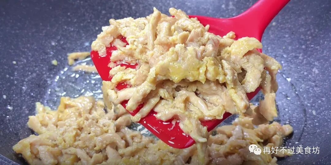 6、接下来起锅烧油,油热以后把腌制好的肉丝倒入锅中,用铲子快速把肉丝划散,把肉丝炒香,炒至变色,炒好之后把它盛出来装入盘中备用。