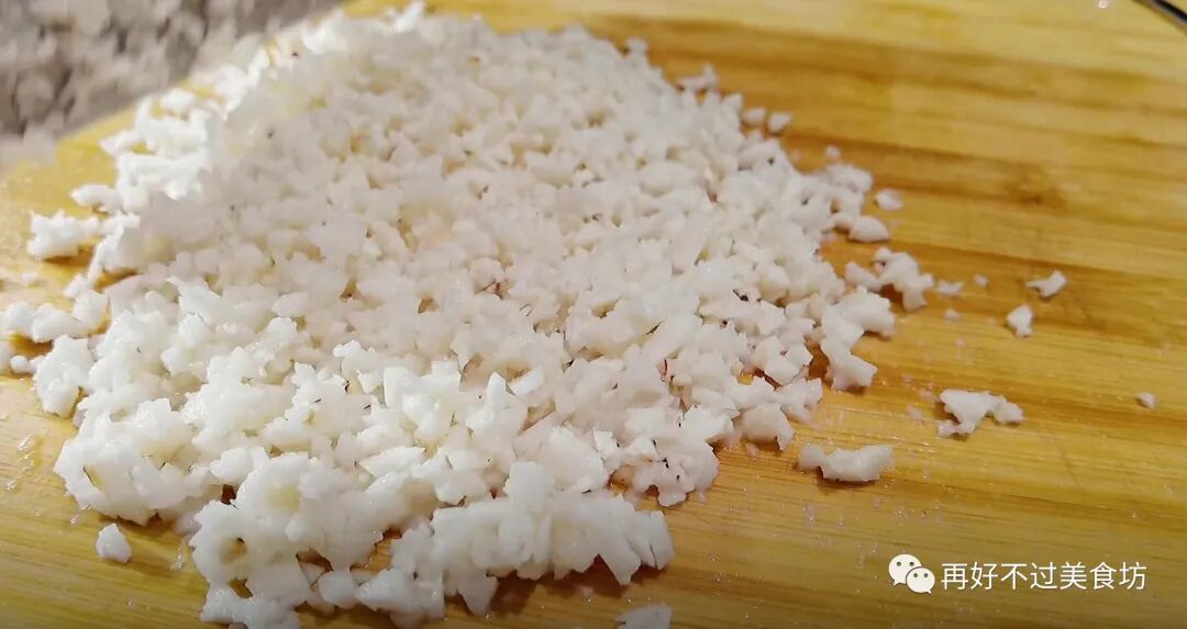 3、接下来就用马蹄做一道非常清便,竭力降火去燥的美食,马蹄先切片,再剁成小一点的颗粒状,也不用剁得太碎,放入碗中备用。
