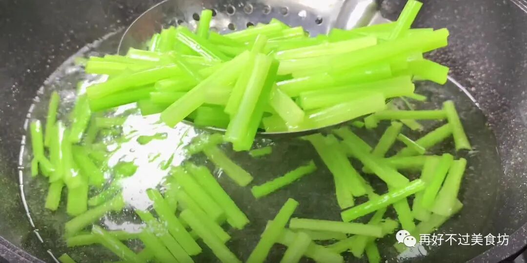 5、在锅中加入适量的水,烧水开后加入少许的食用油,再把芹菜放入锅中,加入食用油可以让芹菜更加的翠绿,焯水的时间也不宜过长,大概30秒左右,就给它捞出来,控干水分,放入盘中备用。