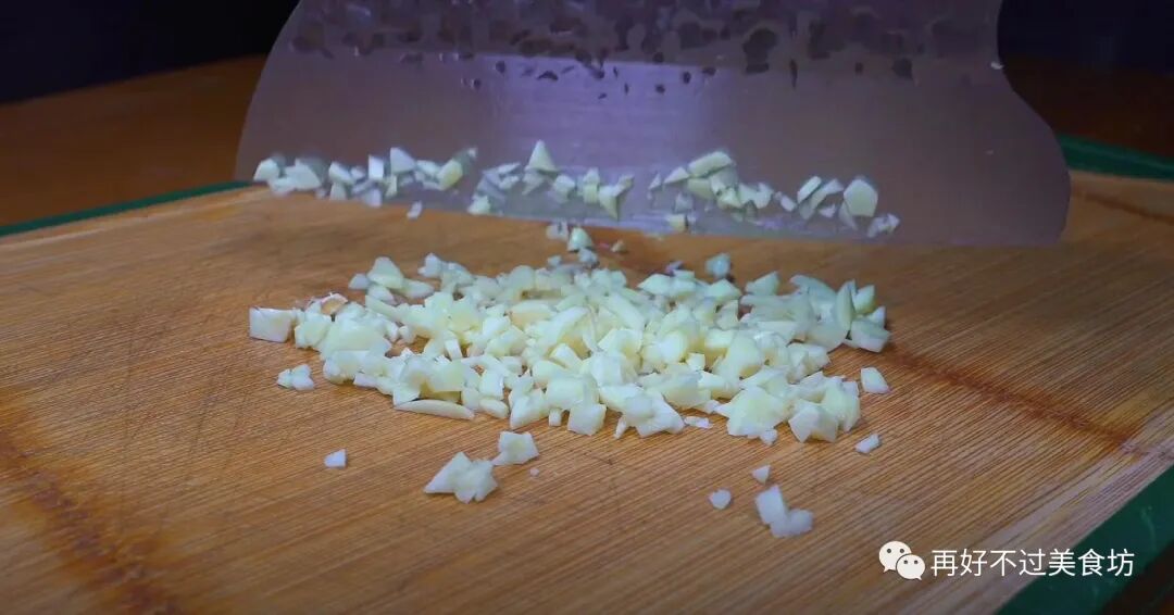11、再准备三粒大蒜,放到案板上,我们先给它切成薄薄的厚片,然后我们再把蒜片给它剁一下,剁成蒜末,剁好以后放进碗中备用。