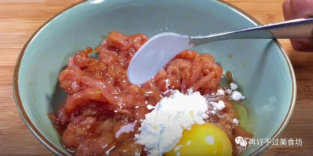 4、抓拌均匀之后再打入一个鸡蛋,加入一勺玉米淀粉,继续用手抓拌均匀,把面粉和鸡蛋抓拌至溶解,抓拌均匀后放一旁腌制15分钟,让肉丝更加入味好吃。