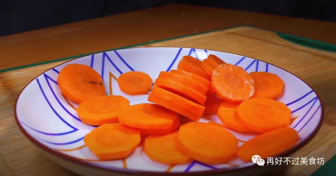 2、再准备一根胡萝卜,先把皮都给它削掉,再把胡萝卜的两头给它切下来扔掉,紧接着改刀给它切成薄薄的厚片,大概0.3毫米左右后就行了,切好以后放进碗中备用。