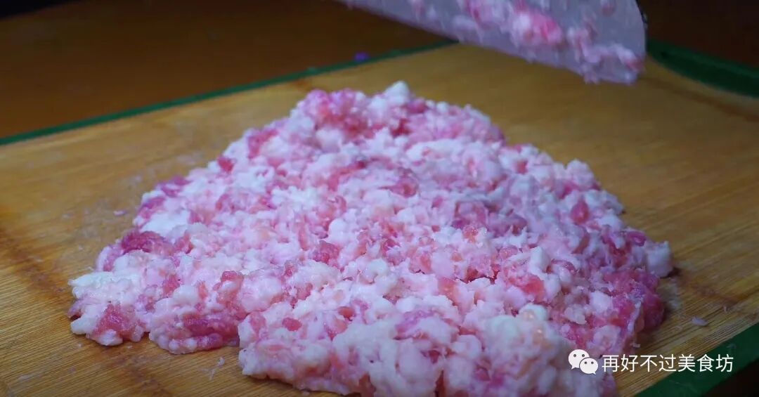 5、再准备一块有肥有瘦的五花肉,把猪皮给它切掉不要,再把肉给它切成薄薄的厚片,肉片切好以后,再给它剁一下,剁成肉末,如果嫌剁起来麻烦的,可以用绞肉机来绞。