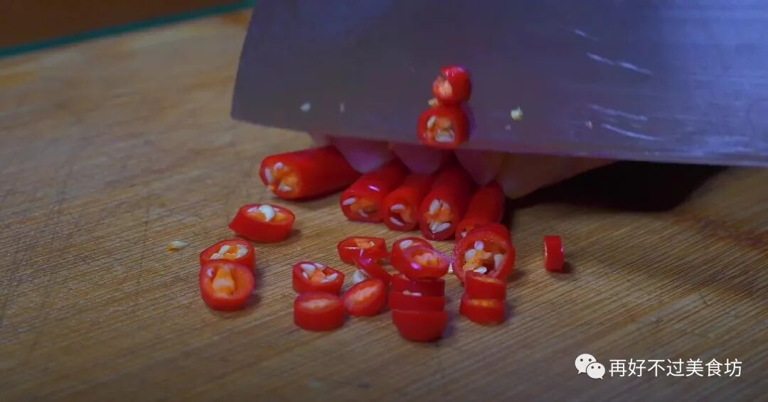 9、准备五颗小米辣,先把辣椒蒂给它去掉,再给它切成辣椒圈,如果不能够吃辣的,可以用红菜椒代替,切好以后放进碗中,放在一边备用。