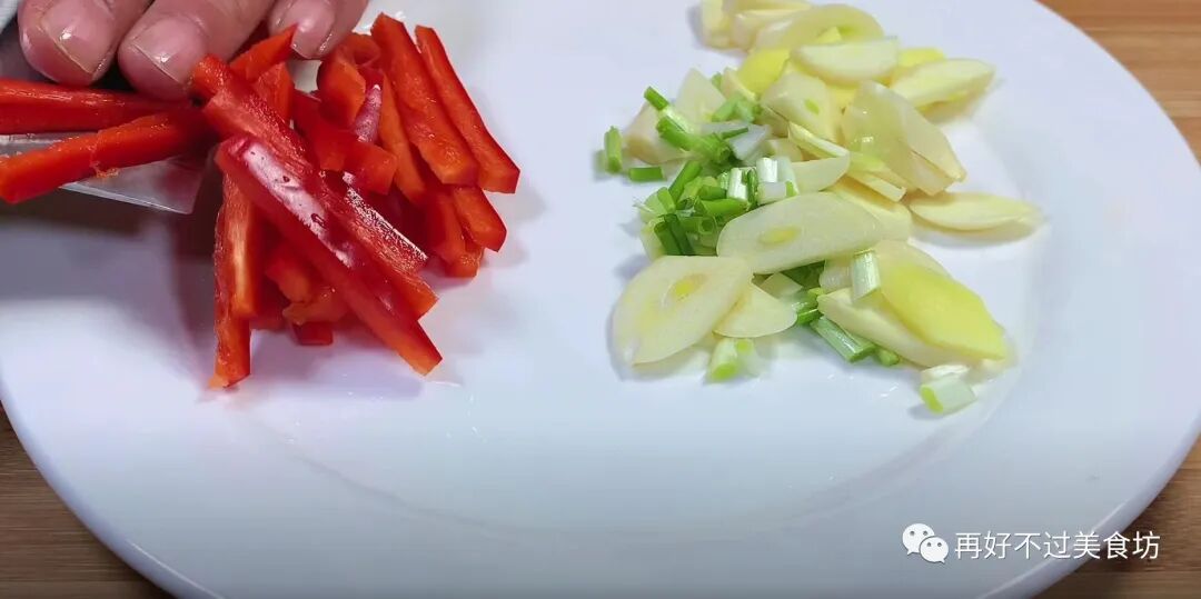 2、再准备一点姜蒜,姜给它切成片,大蒜也给它切成薄片,两根小葱改刀切成葱花,切好后一起给它放盘子里备用,半个大红椒改刀切成丝,切好之后放盘子里备用。