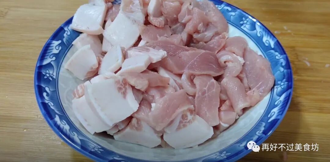 2、准备五块钱的五花肉,改刀把它切成肉片,切好放入碗中备用。