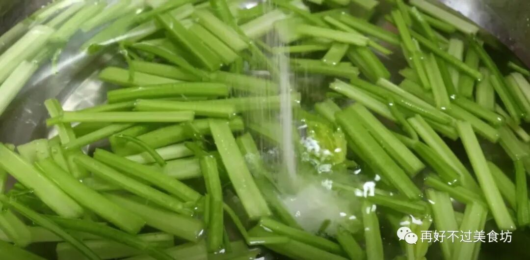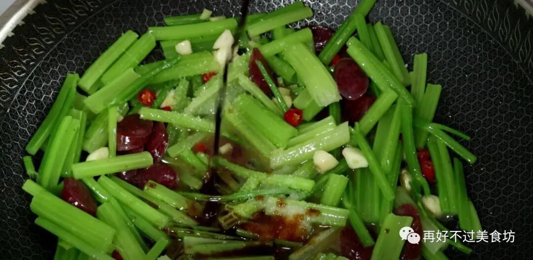 9、下面倒入焯好水的芹菜翻炒均匀,锁住芹菜的水分,加入半碗清水,下面开始调味,加入适量的食盐,一点白糖提鲜,适量生抽,一勺蚝油,先翻炒均匀,让所有的食材入味。