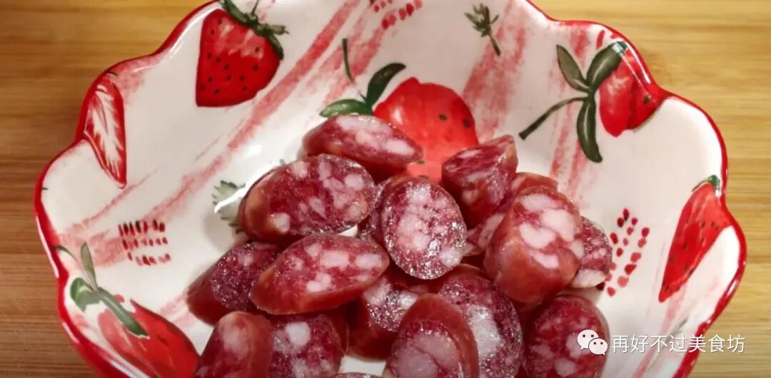 4、准备一根香肠,洗净后切成厚厚的薄片,装入小碗里。
