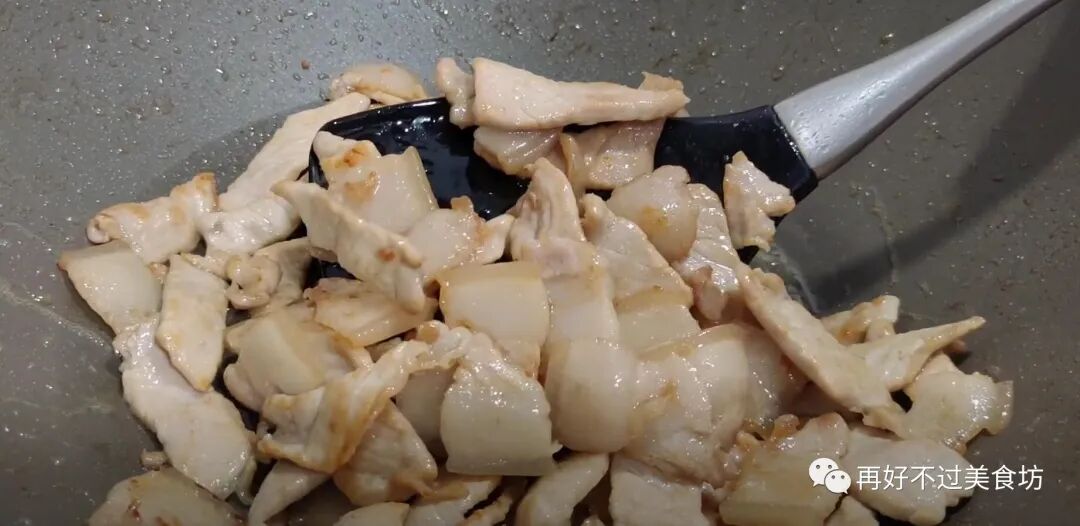 4、另外起锅,倒入少许的豆油,切好的肉片倒进来,给它翻炒均匀,把多余的油脂给它炒出来。