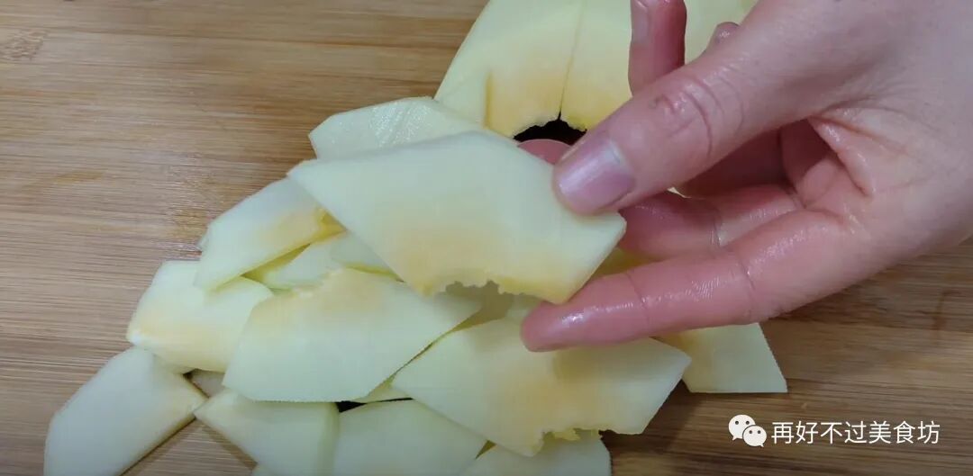 1、首先把木瓜洗干净外皮,用削皮刀把它削掉,再切头去尾,并从中间把它分开,取一把勺子,把木瓜的籽给它刮干净,这个是不能吃的,再把它一分为二,斜刀切成厚厚的薄片,做这道美食的时候,要买这种生一点的木瓜,这样吃着才口感比较爽脆,切好之后放入盘中。