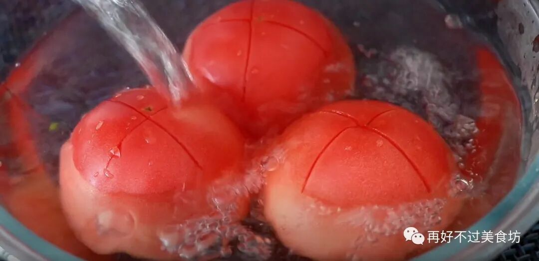 2、准备三个番茄,在顶部花十字花刀,再加入刚刚烧开的开水,给它浸泡五分钟左右。