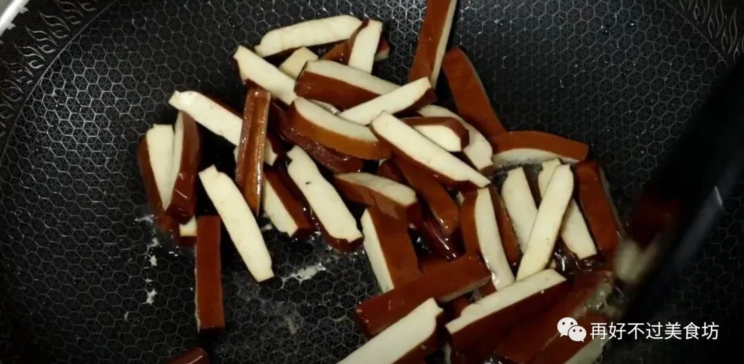 7、锅里多倒一点油,油温烧至五成热,倒入香干,用铲子来回翻炒,把香干炒香,煎至香干表面起泡泡就可以,先盛出来备用。