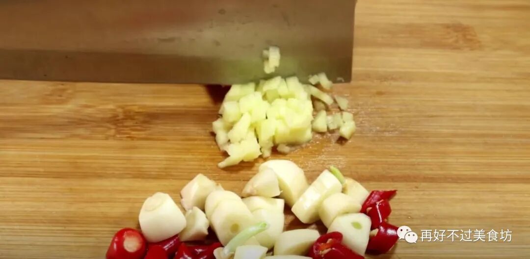 5、再准备三个小米椒,把它切成辣椒圈,一把大蒜切成蒜粒,一块生姜,先切成姜片,再切成细细的姜丝,然后切成姜末,全部切好以后装入盘子里。