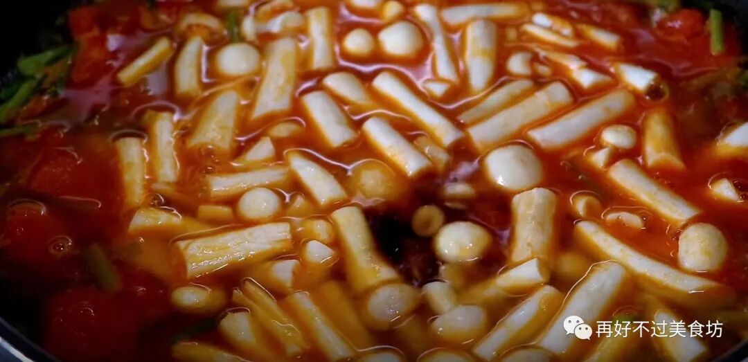 7、等番茄炒至变软出汁之后,加入适量的清水,再放入海鲜菇,加入食用盐,鸡精,生抽,简单的调一下味,搅拌均匀之后,大火烧开,烧开之后再转小火。