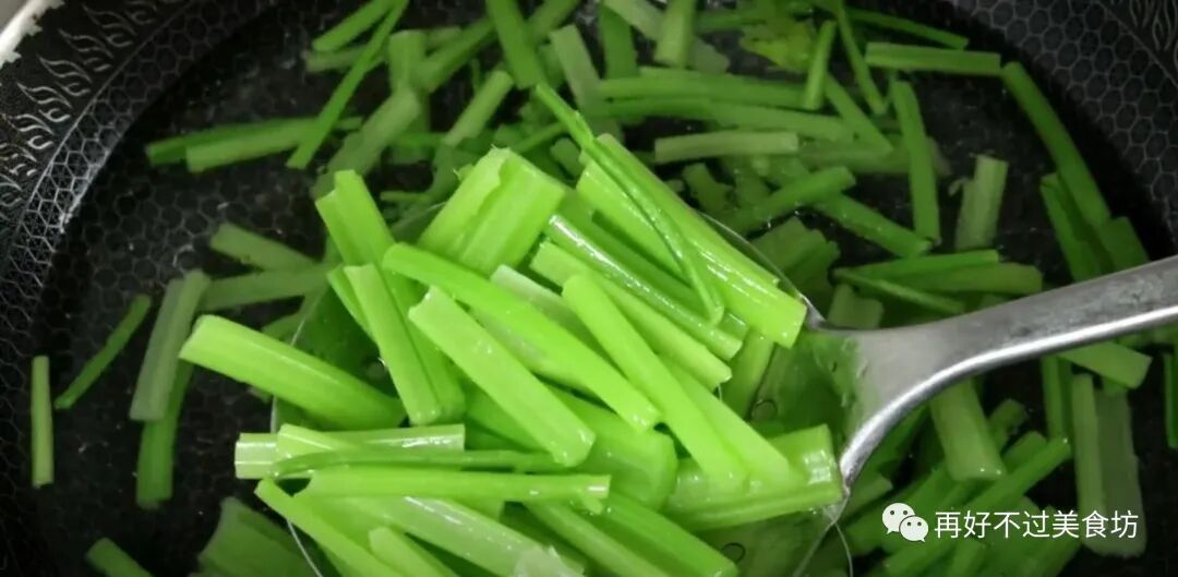 6、锅里烧半锅开水,倒入洗好的芹菜,加入几滴食用油,给芹菜焯一下水,这样芹菜的营养不流失,口感吃起来更嫩,焯水20秒,把芹菜捞出来备用。
