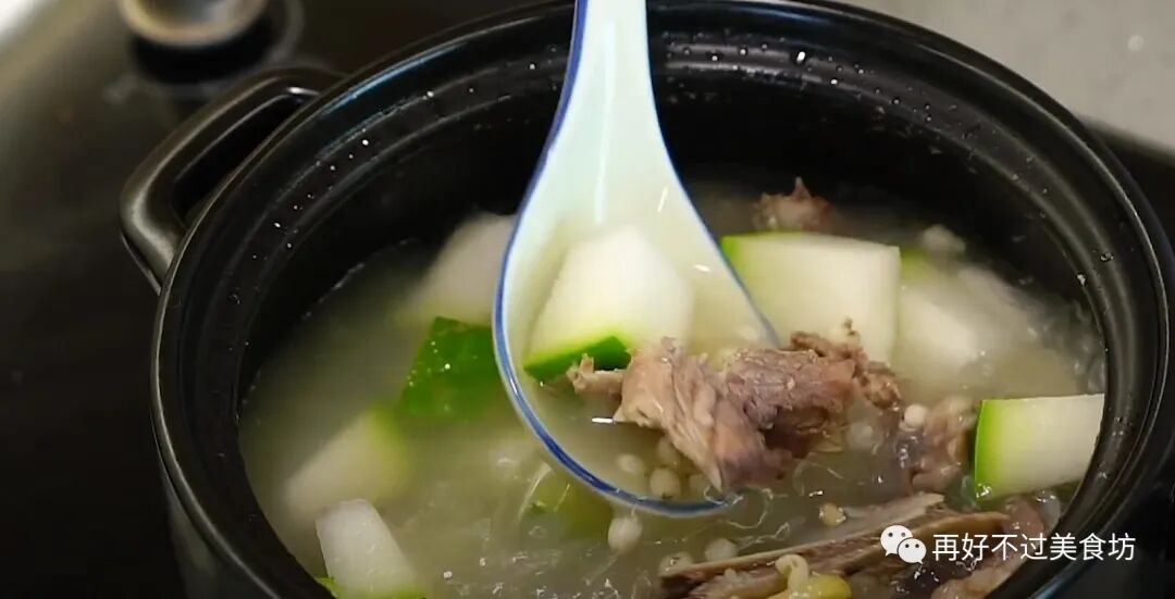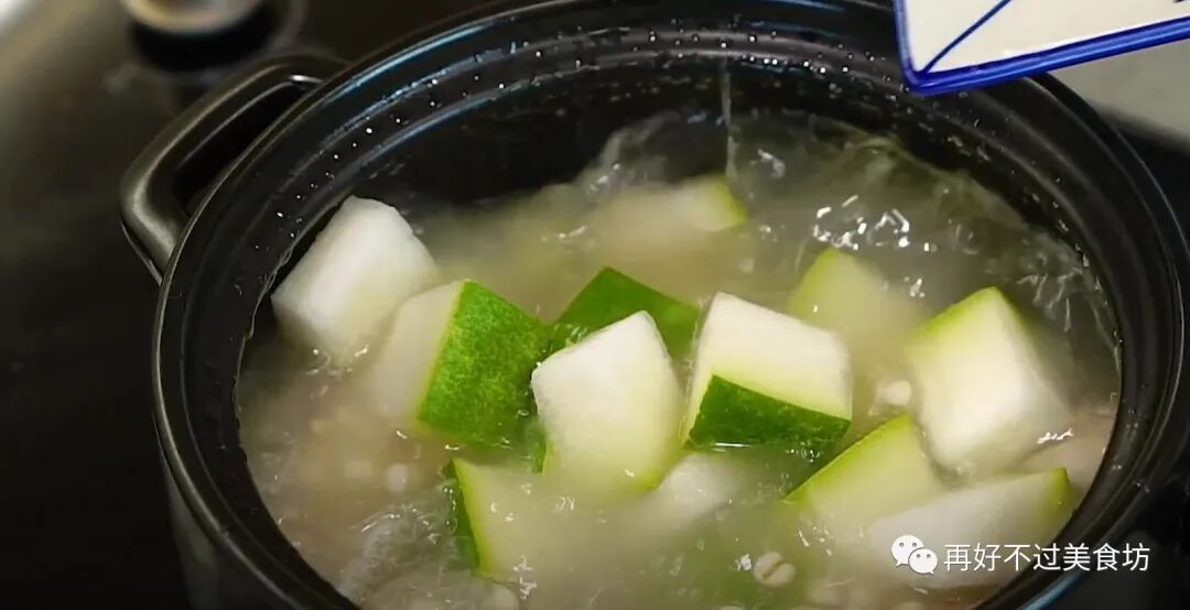 6、这个时候,猪骨汤已经煲了半个小时,薏米都煮熟了,接下来把冬瓜放进去,再煲十分钟,把冬瓜给煮熟。