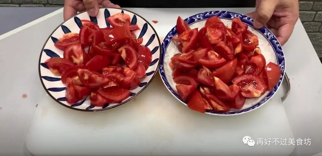 3、利用焯水的这个时间,准备几个西红柿,改刀切成大块,切好放盘子里备用,当然最好是分两个盘子装。