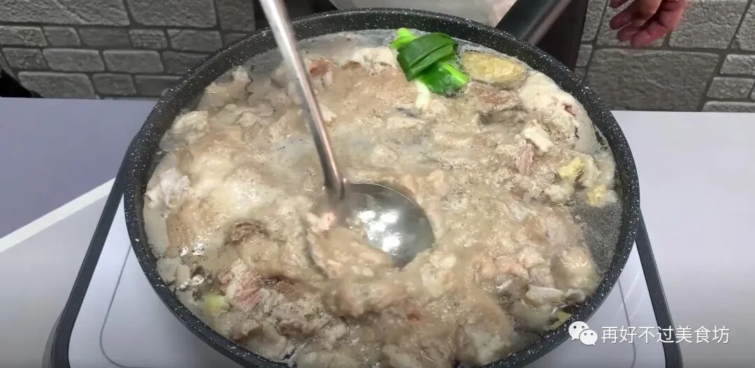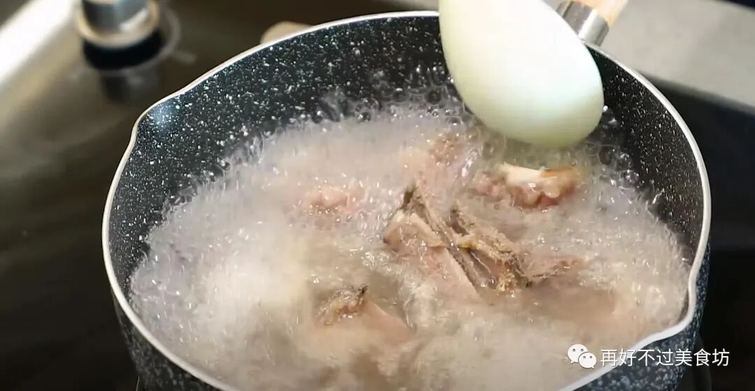 4、锅里水开以后,把上面的浮沫撇净,撇净以后,捞出放到温水里面,再给它洗一洗,洗掉附着在表面的杂质,洗干净后放一边备用。