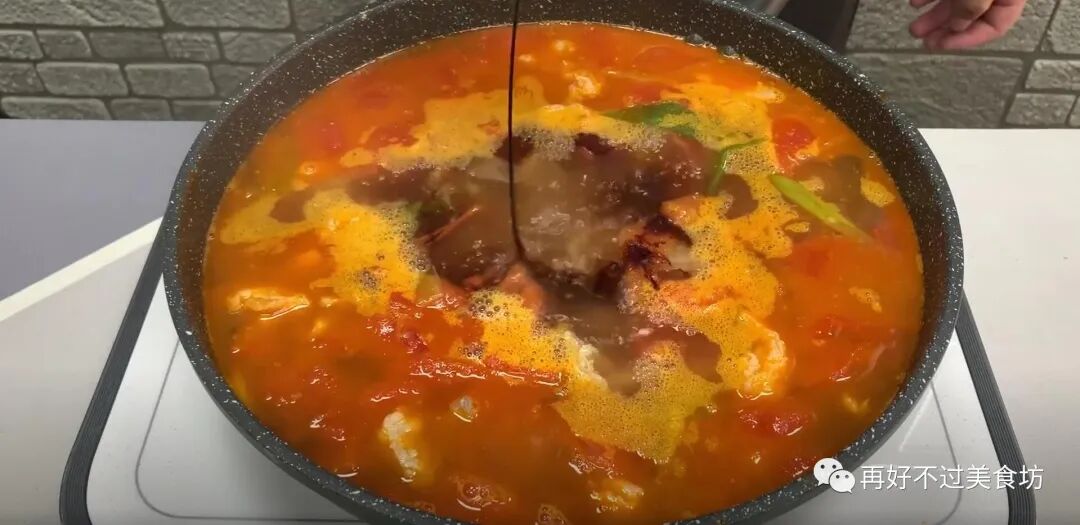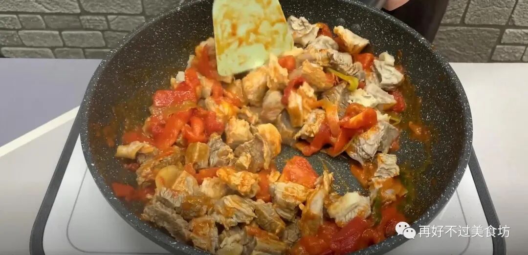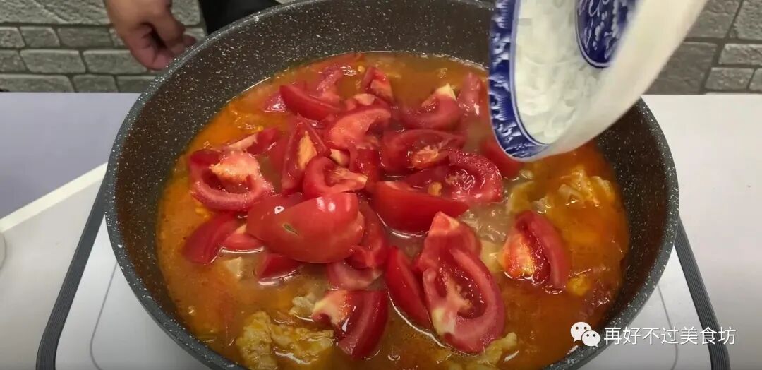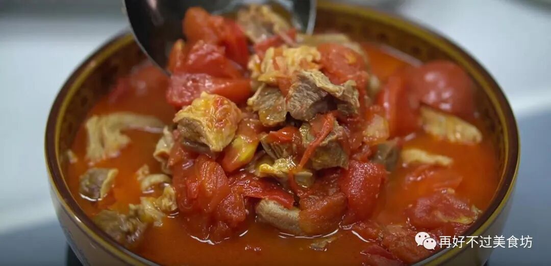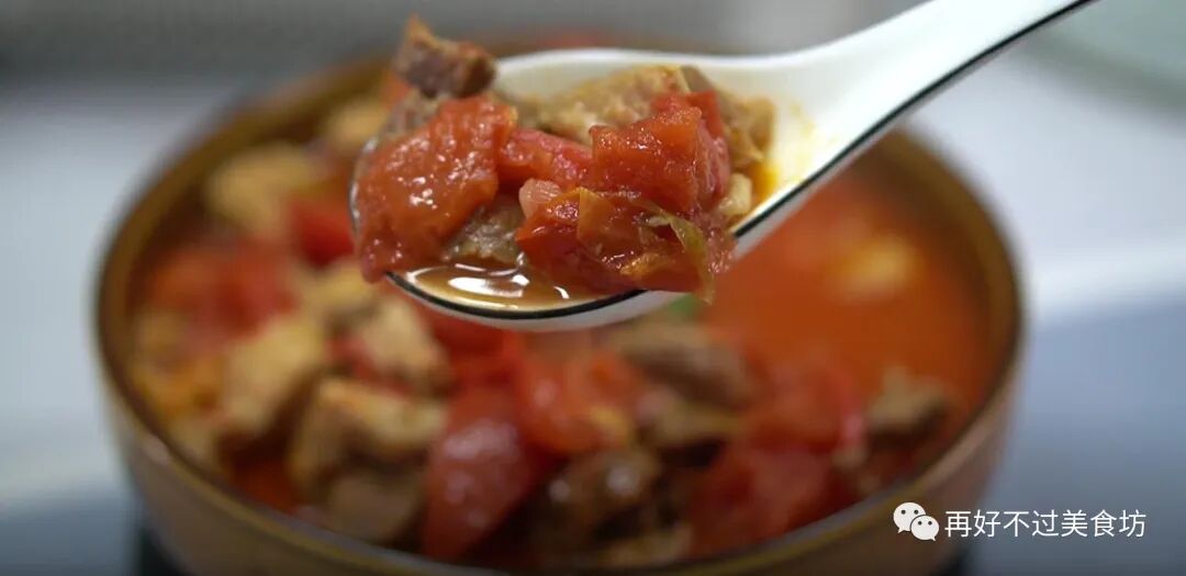 8、到点以后,打开盖子,汤汁已经少了一大截,牛肉也已经完全成熟了,然后倒入另一半西红柿,调味的话,就放点盐,鸡精,再来点胡椒粉,其他什么调料都不用放了,盖上盖子持续开中大火,把汤汁给它收至浓稠,大概15分钟左右,即可出锅装盘。