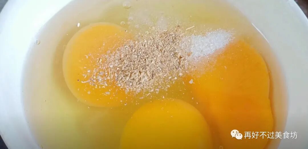 3、鸡蛋和枸杞煎是黄金搭档,吃枸杞尖一定要配鸡蛋,来上三个鸡蛋,放少量的盐和草果,将鸡蛋调成鸡蛋液。