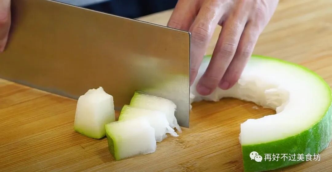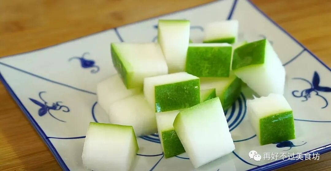 5、下面再来切点冬瓜,把冬瓜洗干净,把籽去掉,再把冬瓜切块,皮不用削掉,切好放盘子里备用。