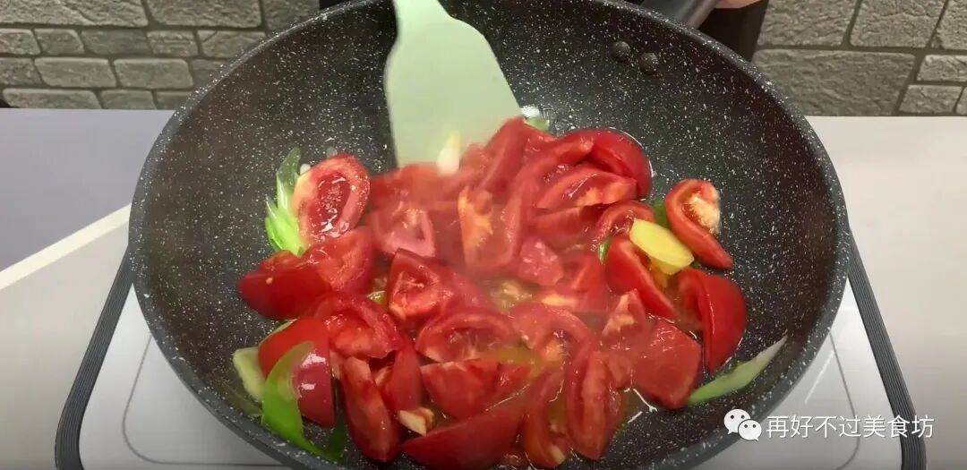 5、下面起锅烧油,往锅里放入大块的葱姜,炒出香味以后,倒入一半的西红柿,这一步,尤为重要,一定让这个西红柿多炒一会,炒熟炒透,炒出汤汁。