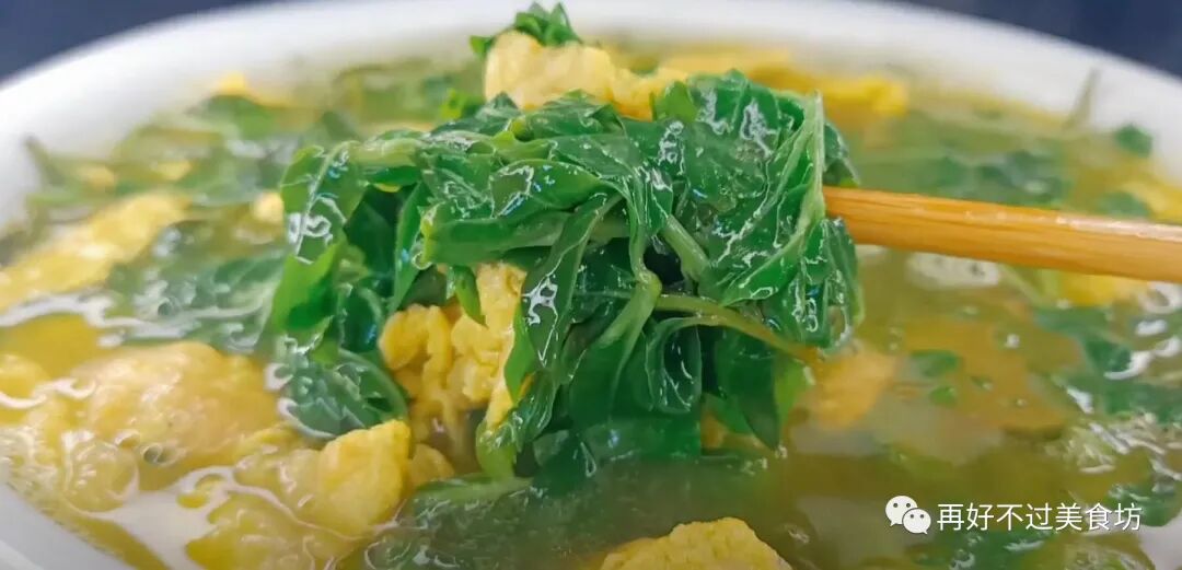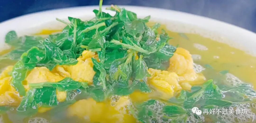 7、就这样,一份鲜香脆嫩爽口的枸杞尖鸡蛋汤就做好了,营养价值和实用价值,都非常的高,春季一定要来上这么一碗枸杞尖鸡蛋汤,清热明目、爽口,整个人都神清气爽了。