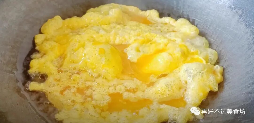 4、油温七成热,下入调好的鸡蛋液,将鸡蛋炸至两面金黄,煮枸杞汤的鸡蛋要炸一炸,炸出香味,这样汤更加的香,鸡蛋的香和枸杞的鲜搭配在一起,真的是太绝了,再用铲子把鸡蛋分成小块,这样能方便食用。
