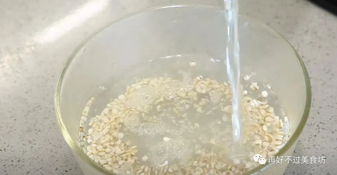 2、烧热后转小火,再倒入薏米,然后不停地翻炒,炒两分钟,把它倒出来,之后加入开水浸泡一个小时。