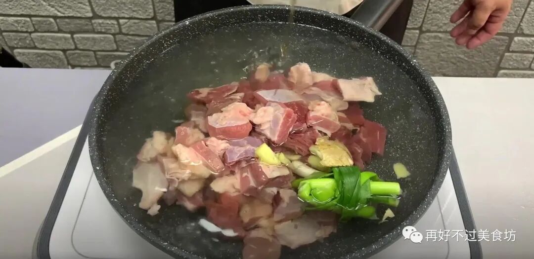 2、将牛肉先改刀切成条,再切成大块,然后冷水下锅,放点大块的葱姜,再淋入料酒给它去去腥。