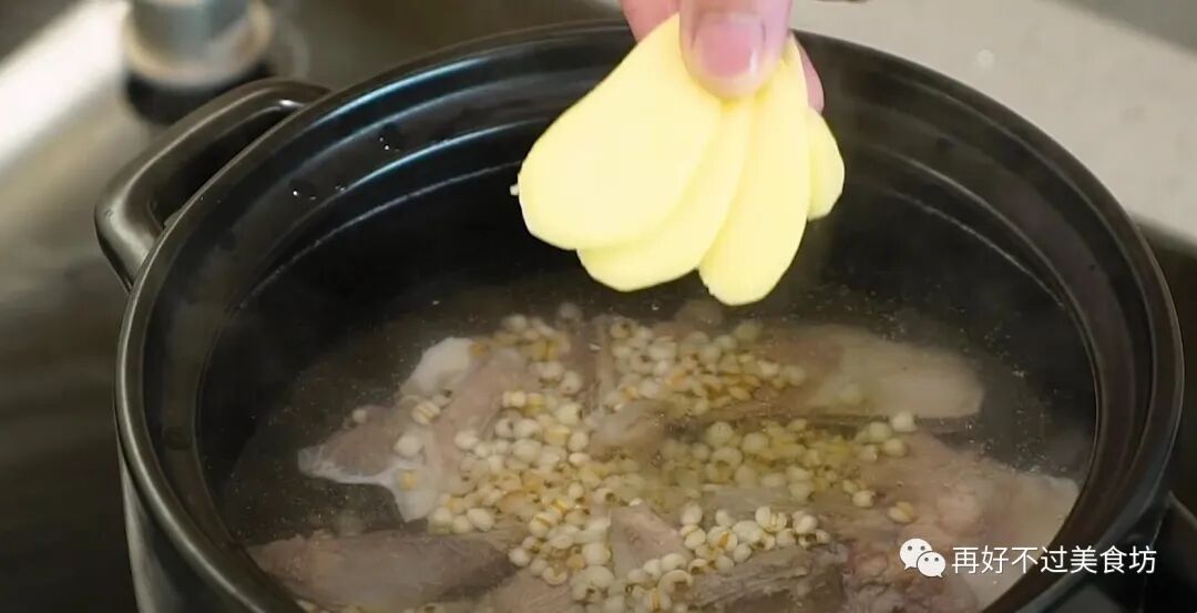 4、把猪骨放到砂锅里面煮,再加入浸泡了一个小时的薏米,然后来几片姜,盖上盖子煮开,煲半个小时。