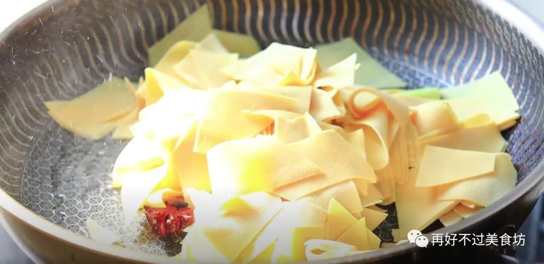 7、锅中倒入适量的油,油温微热,加入一小把的花椒,用小火慢慢的把花椒里的麻香味炸出来,炸香以后,将花椒籽给捞出,直接把滚烫的花椒油泼在配料上面,让它激发出香味。