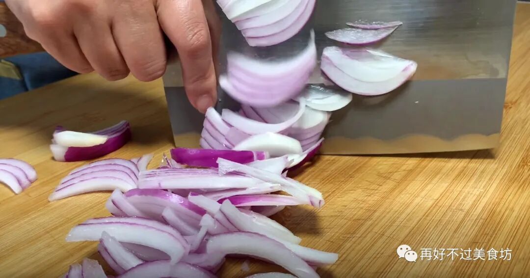3、接下来再切点配料,半个洋葱切成细丝,红菜椒一个对半切开,切细丝,一把大蒜直接拍碎切末,几根香菜切长段,全部切好后,放一旁备用。
