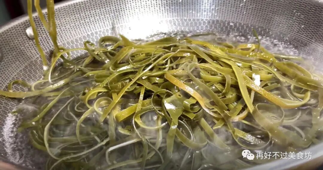5、锅中水开,直接倒入切好的海带丝,焯水一分钟,这样能够彻底的去除海带中的腥味,而且焯水后的海带口感又脆又嫩,然后控水捞入凉水盆中过凉,再沥干水分备用。