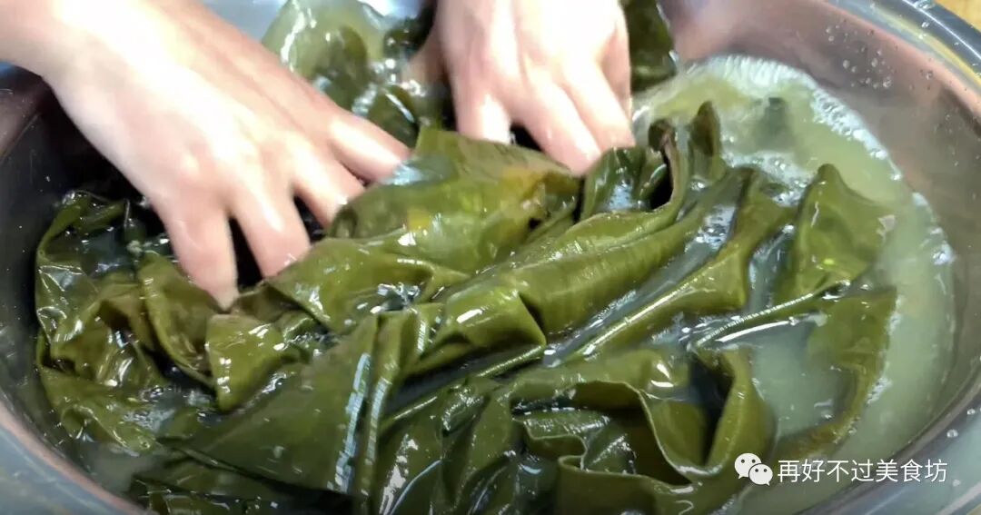 2、海带蒸好以后,直接放入凉水盆中,加入适量的白醋,加入一勺盐杀菌去除腥味,然后再搓洗五分钟,搓洗掉上面的泥沙,再用流动的水多冲洗几遍,清洗干净,这会儿的海带稍微还有点硬,加入水再浸泡15分钟备用。