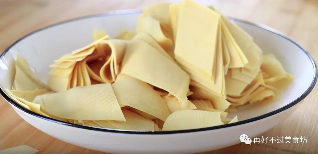 2、再来准备一点干豆腐,也就是我们所说的千张,先是切成长方形,然后将切成正方形的豆皮,全都叠加在一起,再改刀切成菱形状,切好后也放盘子里备用。