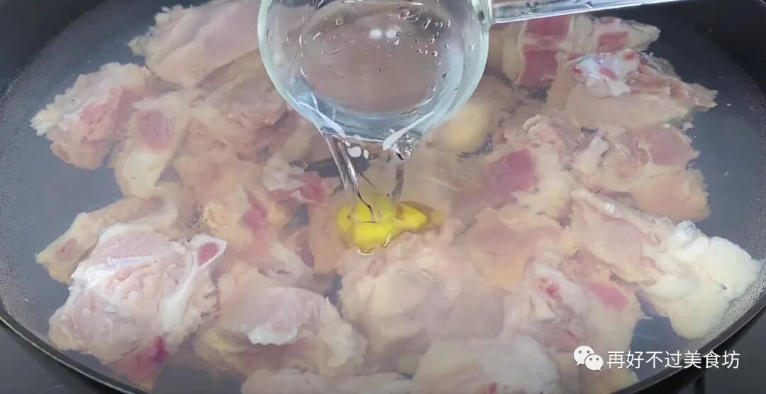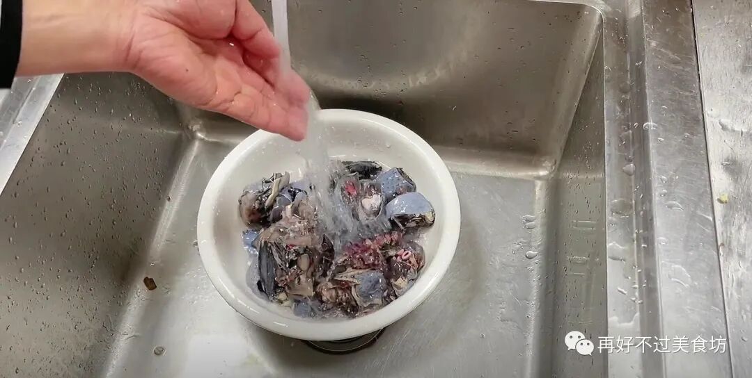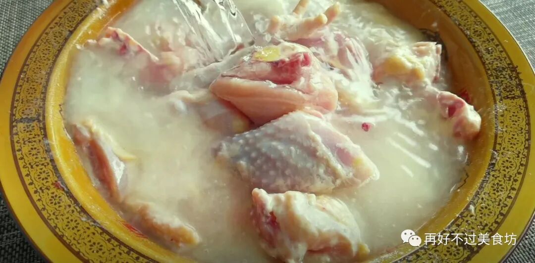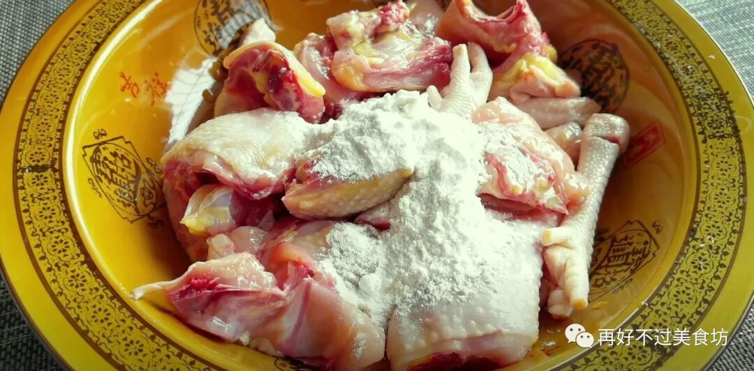 2、之后撒入面粉和适量的清水,再用手抓拌均匀,面粉可以吸附鸡肉里面的血水,这样洗出来的鸡肉更干净,反复清洗几遍后,就沥干水分放一旁备用。