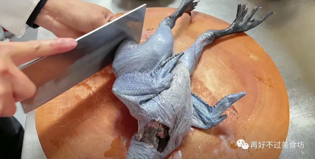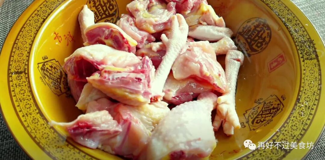 1、先用清水将这一只养了388天的老母鸡清洗干净,然后给它改刀,把爪子和翅膀切下来,再全部剁成小块放大碗里。
