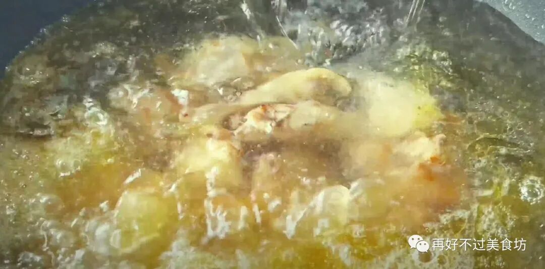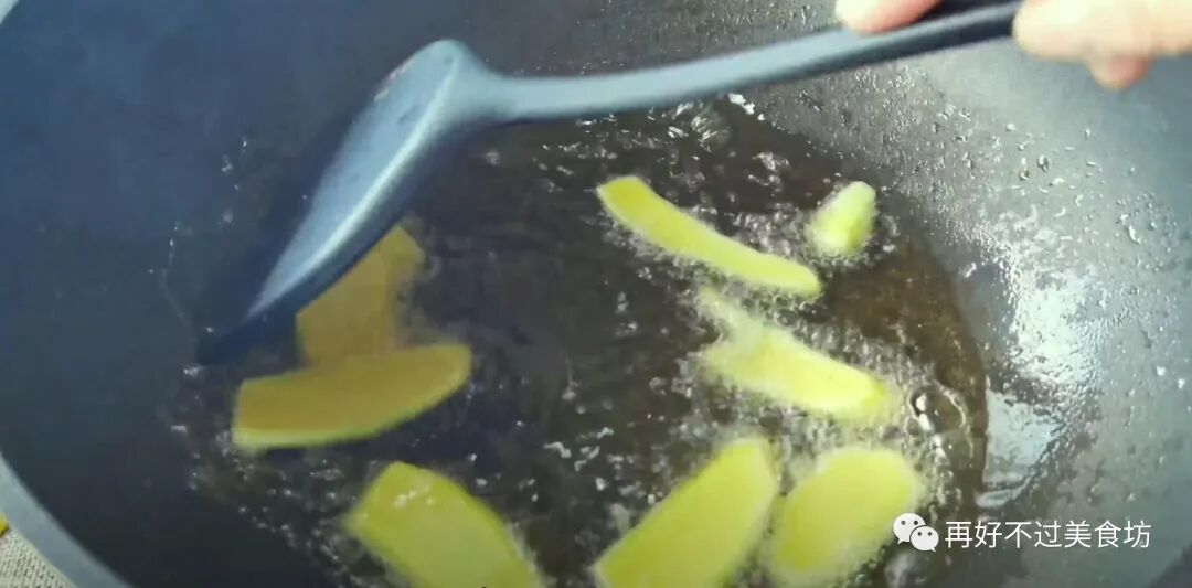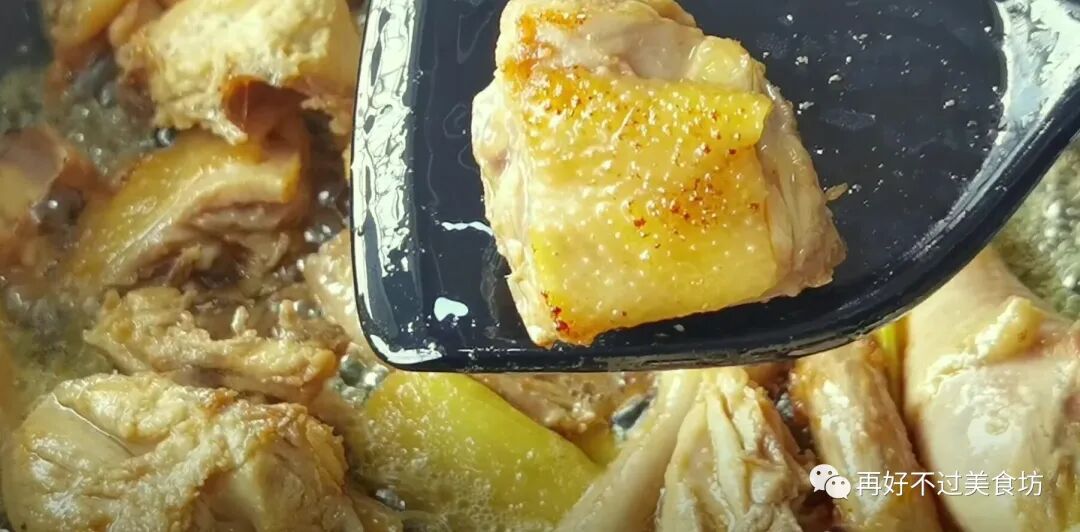 9、油热后,倒入适量的鸡油进锅里煸炒,炒出油渣后,将油渣捞出再倒出姜片翻炒出香味,然后再倒入鸡肉快速翻炒,炒干水分,炒至鸡块微微焦黄就好了。