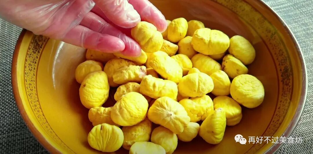 4、准备一些去皮的板栗,也用清水清洗一遍,就放在大碗里留着备用。