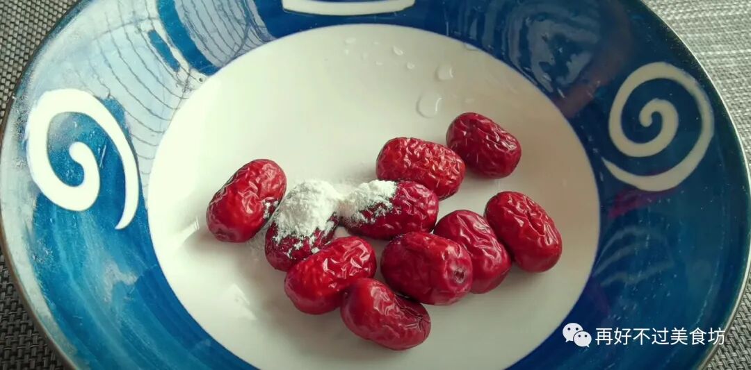 6、再准备一小把红枣,加入少许面粉和清水,给它抓洗几下,这样能更好清洗掉残留在褶皱里的脏东西,洗干净后沥干水备用。