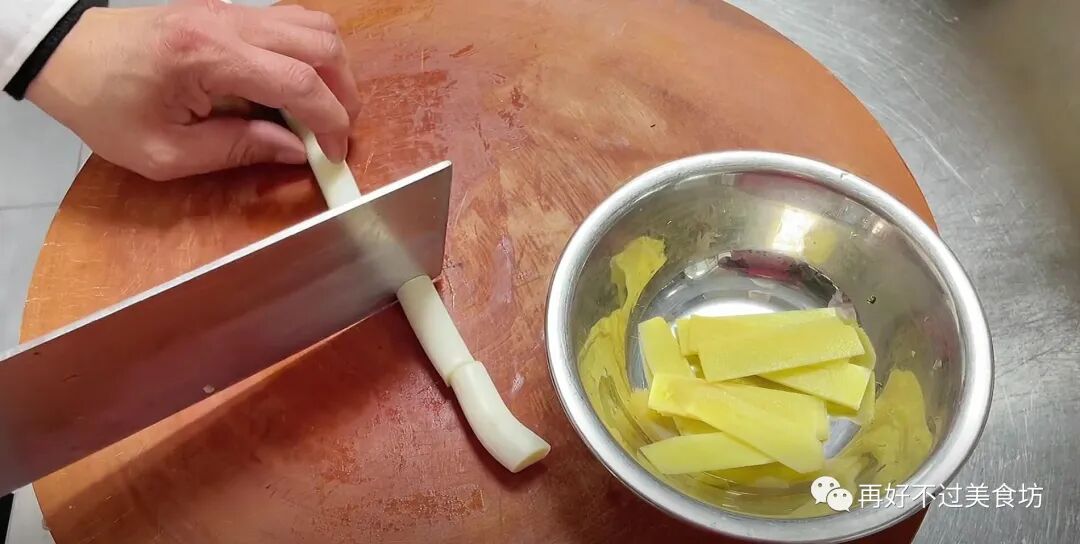 5、下面来准备配料,洗净的铁棍山药一根,切记去皮的时候,一定要戴上手套,因为山药中含有大量的皂角素,摸到手上会非常的刺痒,将山药皮去除干净,然后再切成均匀的棱形块,切好后放入碗中备用。