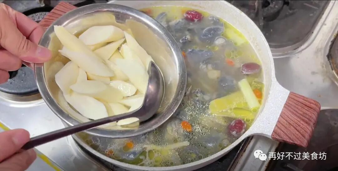 13、这时已经炖制10分钟,锅里的汤已经非常鲜美,我们再将洗净的山药倒入锅中,切记山药不要用开水煮制,免得里面的营养流失。