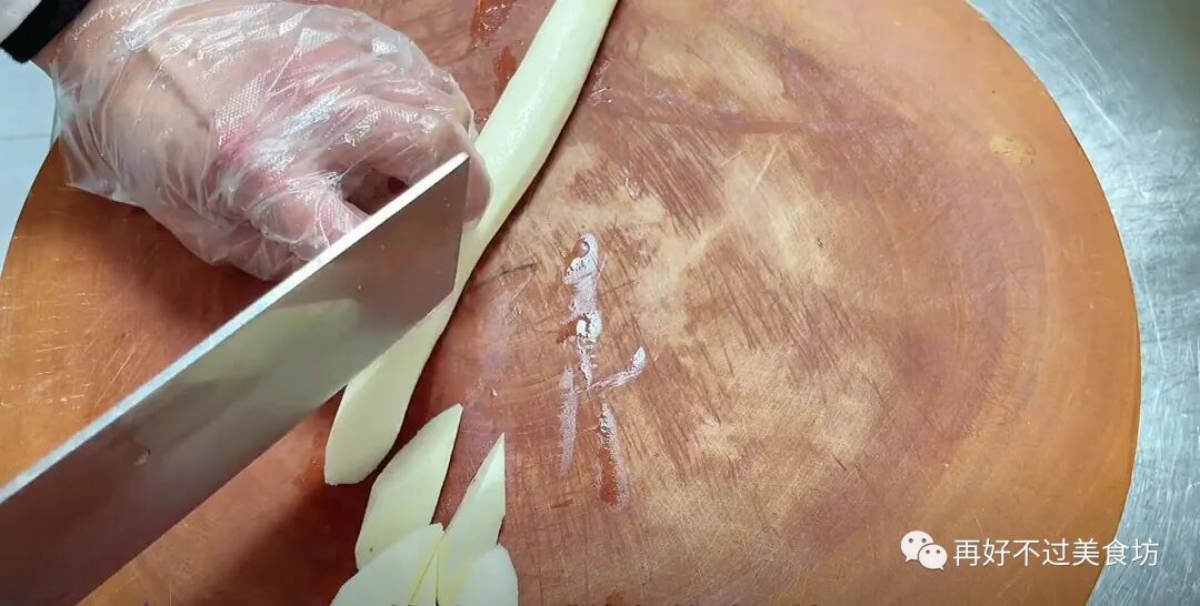 5、下面准备一块生姜,然后改刀切成姜片,生姜可以起到去腥增香的作用,切好后放一旁备用。