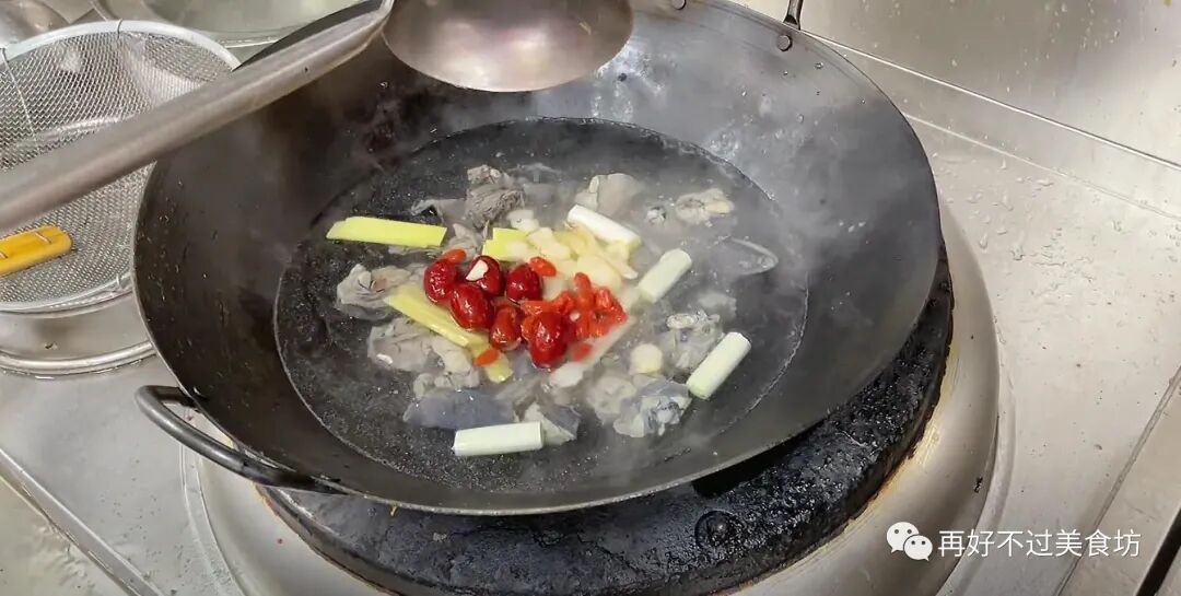 10、乌鸡倒入锅中,切记一定要冷水下锅,这样随着水温的升高,里面的血水会释放出来,这些血沫都是腥味的根源,将它打捞干净,这样炖出的鸡汤才不会发腥,煮好后倒出控水备用,再用冷水冲洗干净。